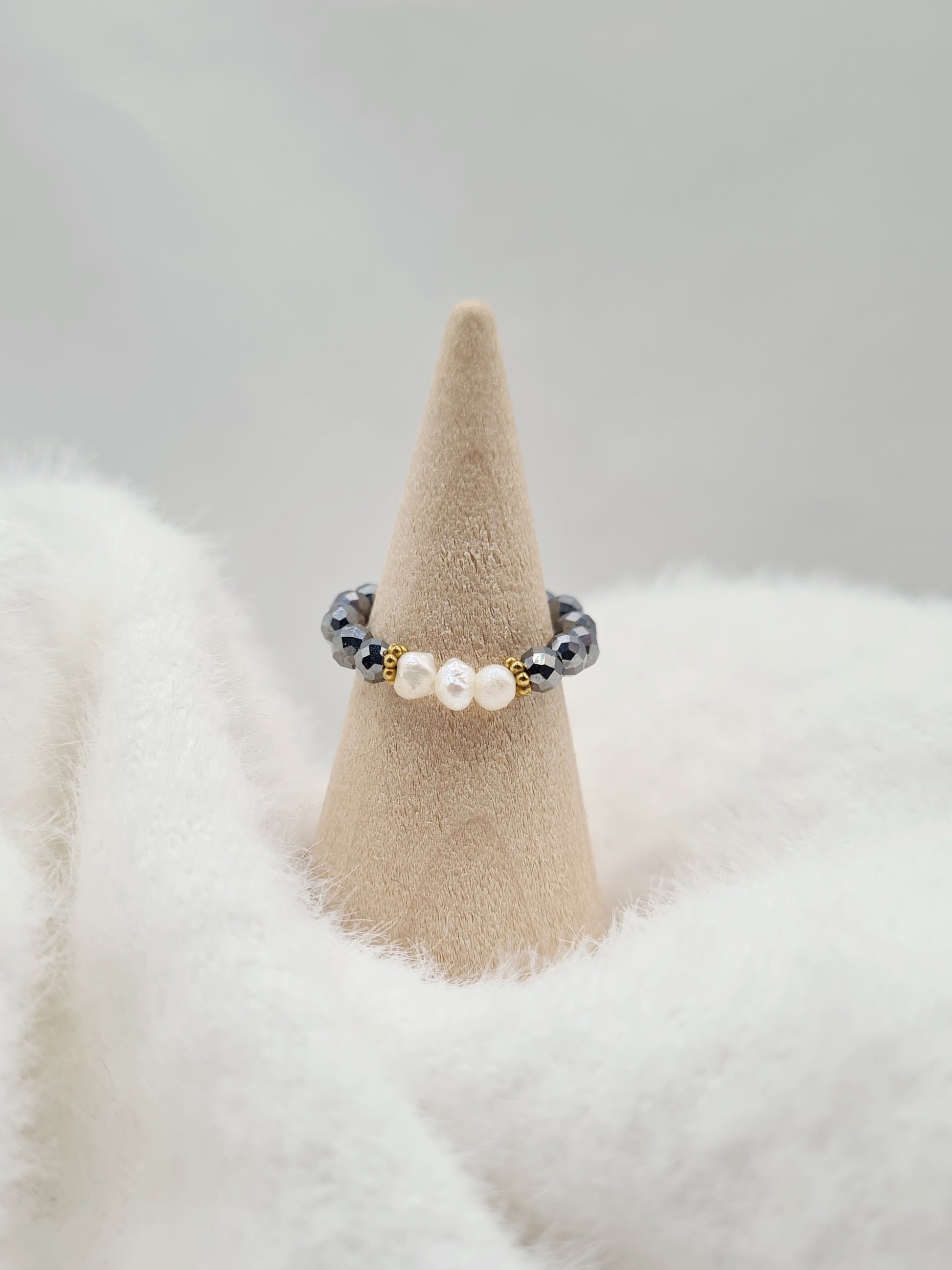 Lizzie est une bague élastique ornée de Perle d'eau douce et de Terahertz étincelantes pour plus d’éclat.