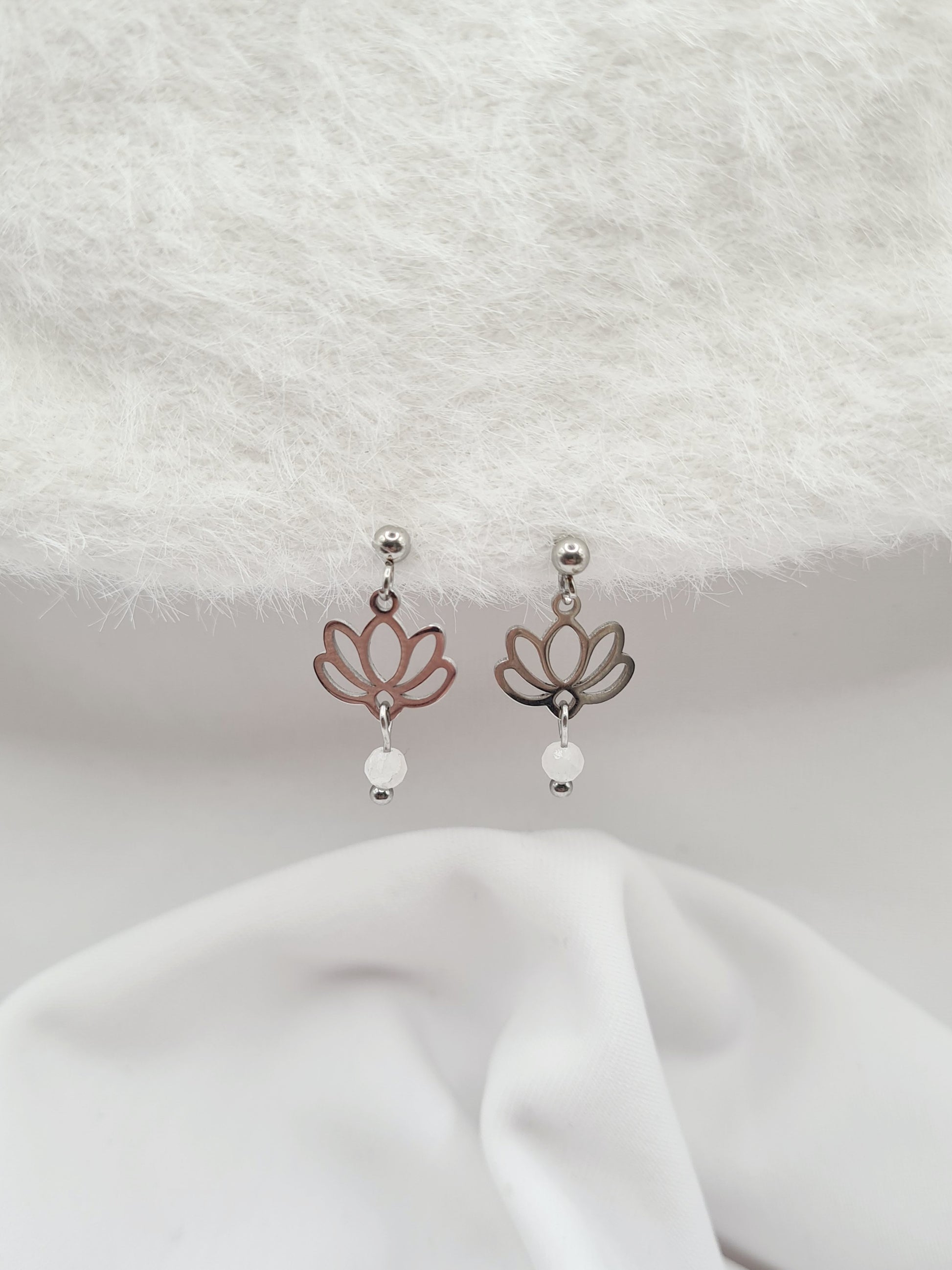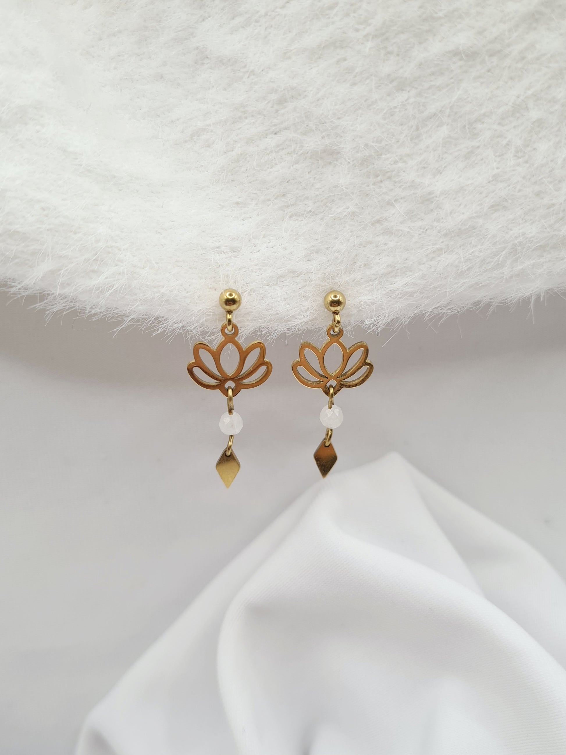 Fleur sacrée sont des boucles d’oreilles en acier inoxydable avec des pierres naturelles. Tu peux choisir un autre pierre en accord avec toi ;)