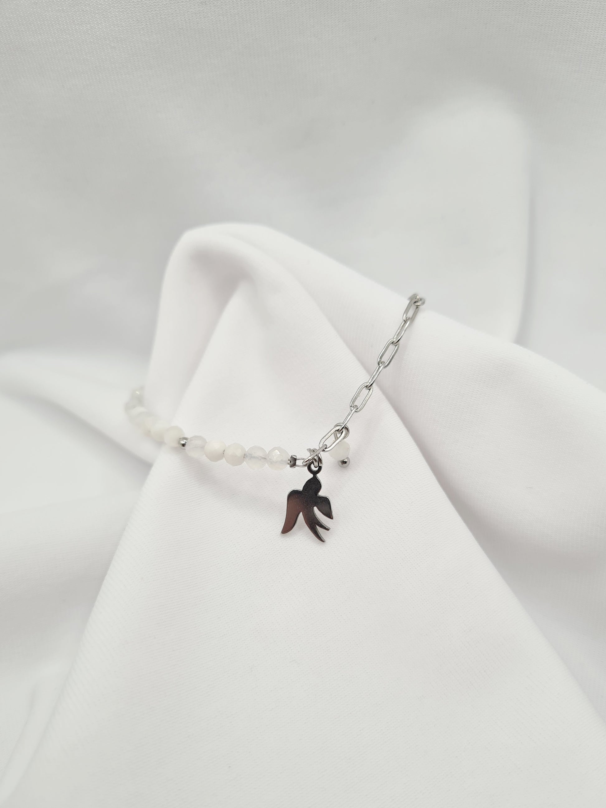 Carlita est un bracelet en acier inoxydable avec de véritables pierres naturelles orné d'une pampille hirondelle.