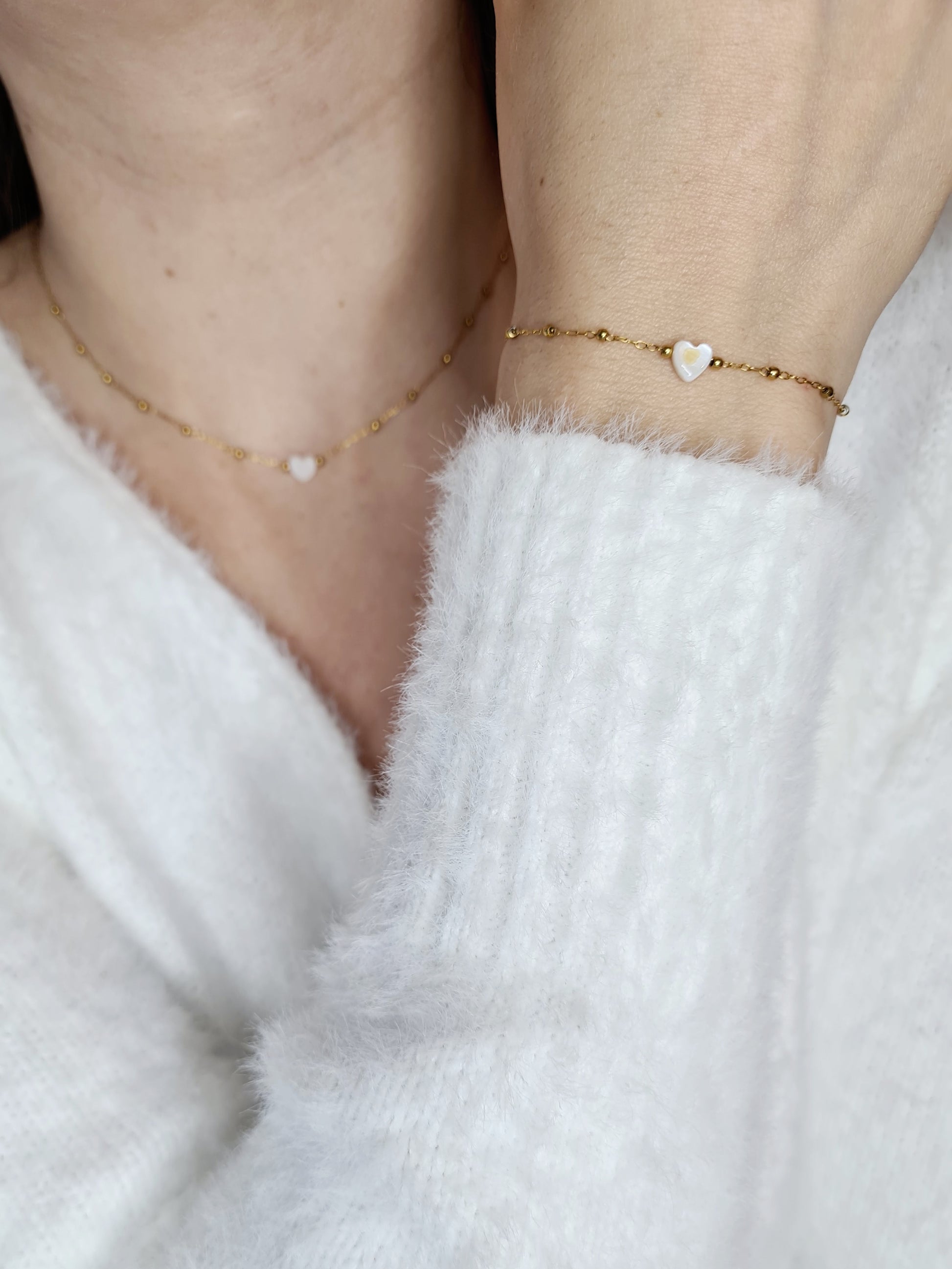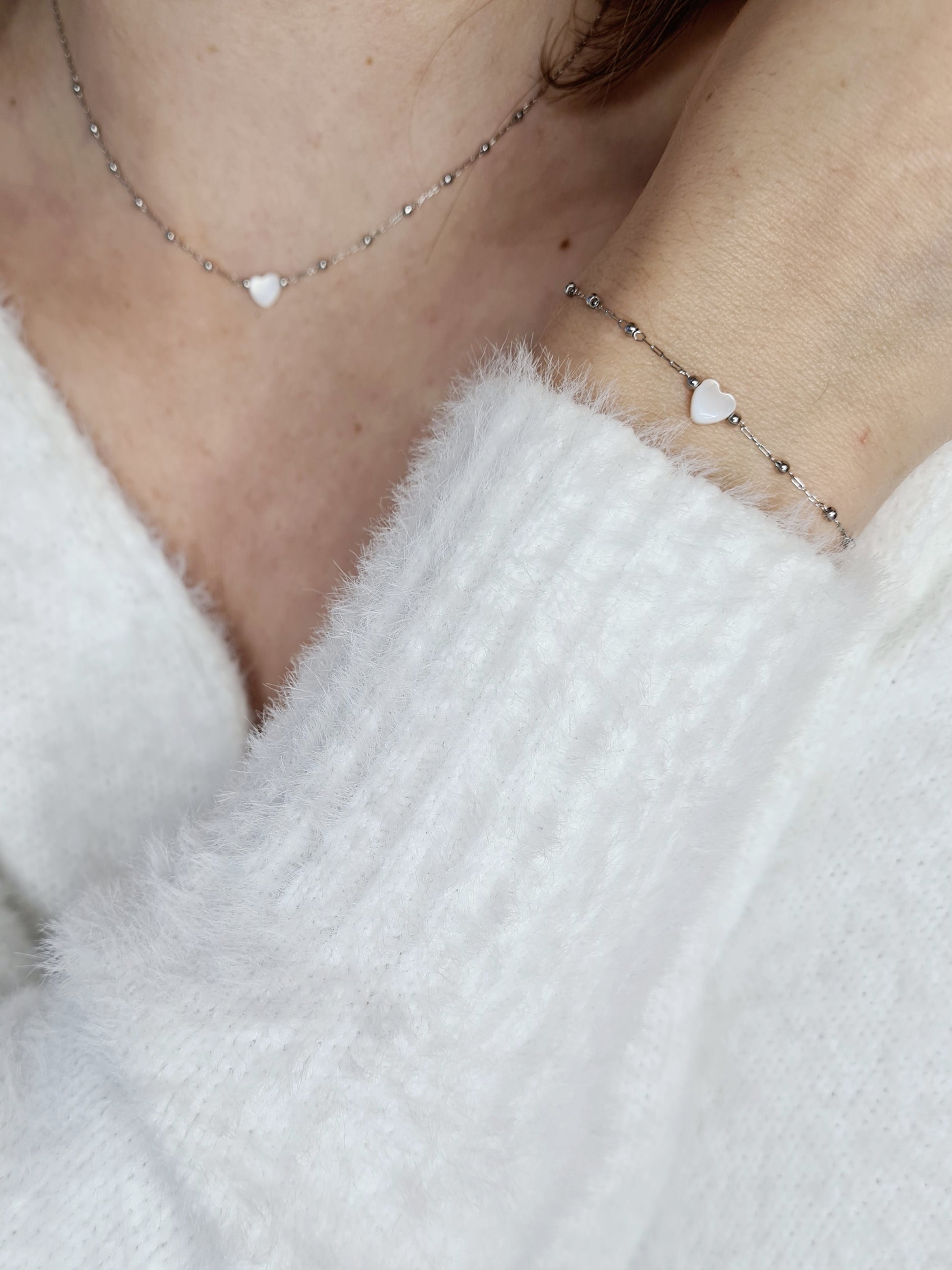 Manon est un bracelet en acier inoxydable orné d'une pierre naturelle coquillière en forme de coeur.