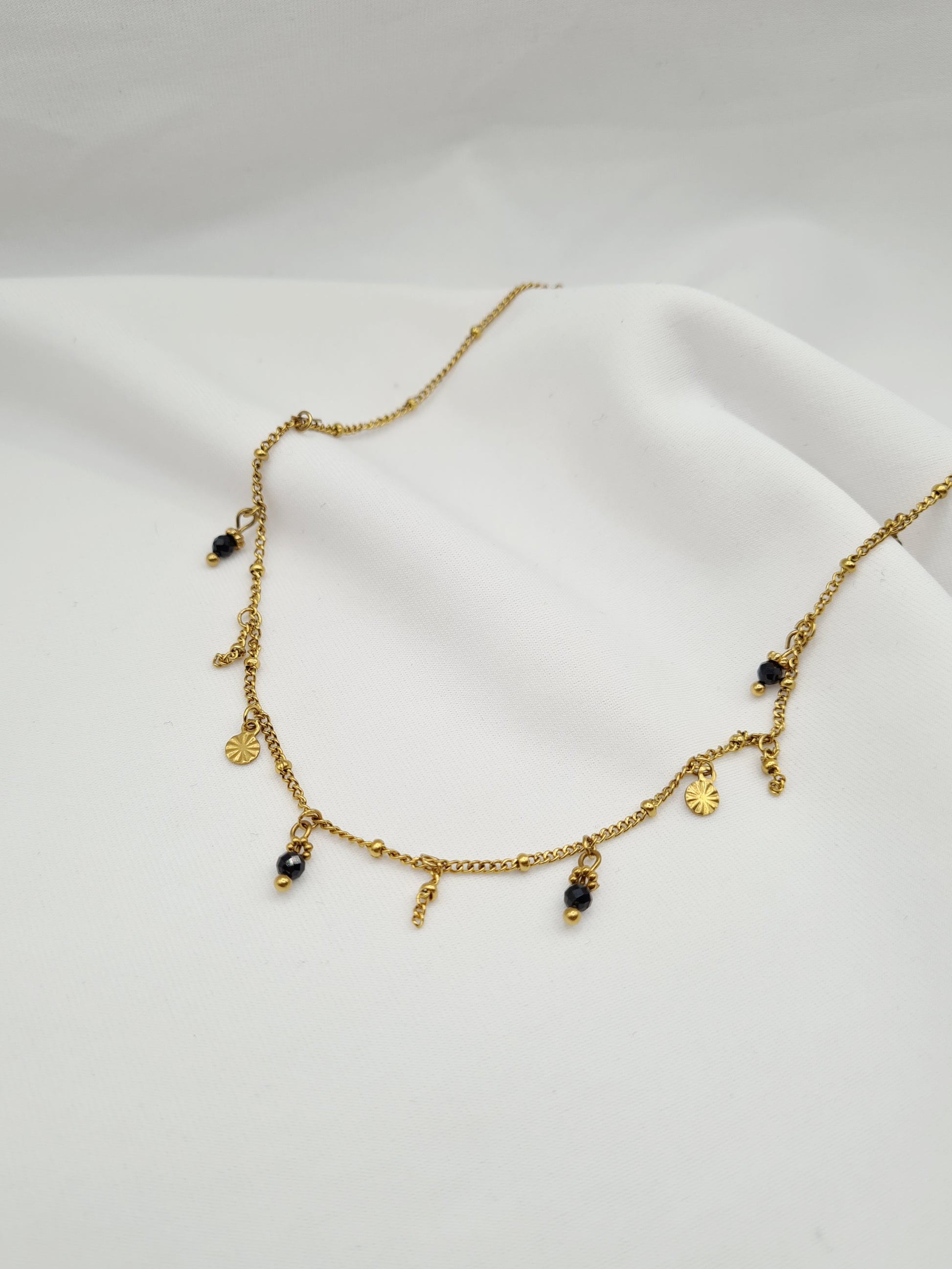 Andréa est un collier en acier inoxydable orné de pampilles et de pierres naturelles.