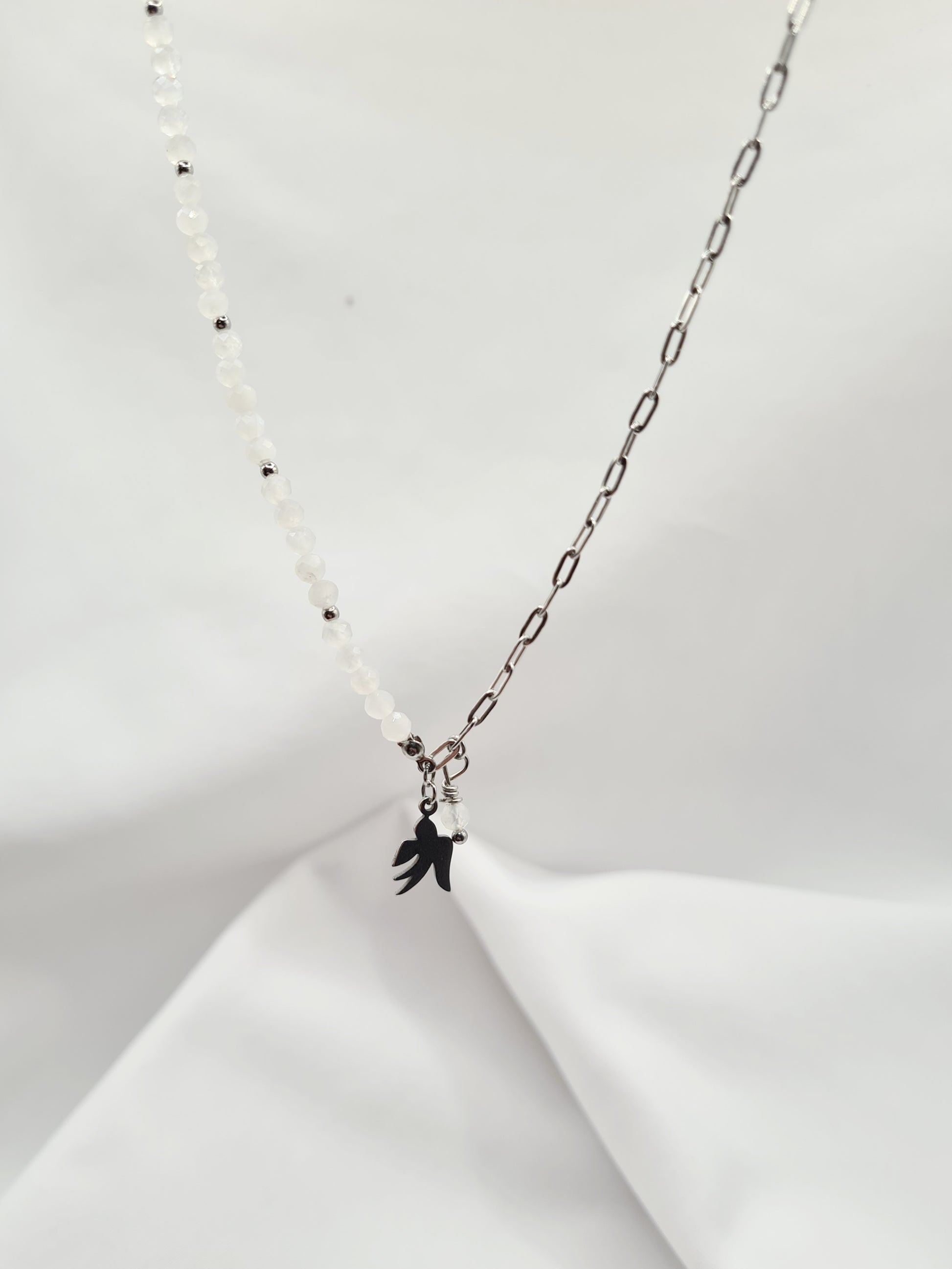 Carlita est un collier en acier inoxydable avec de véritables pierres naturelles orné d'une pampille hirondelle.