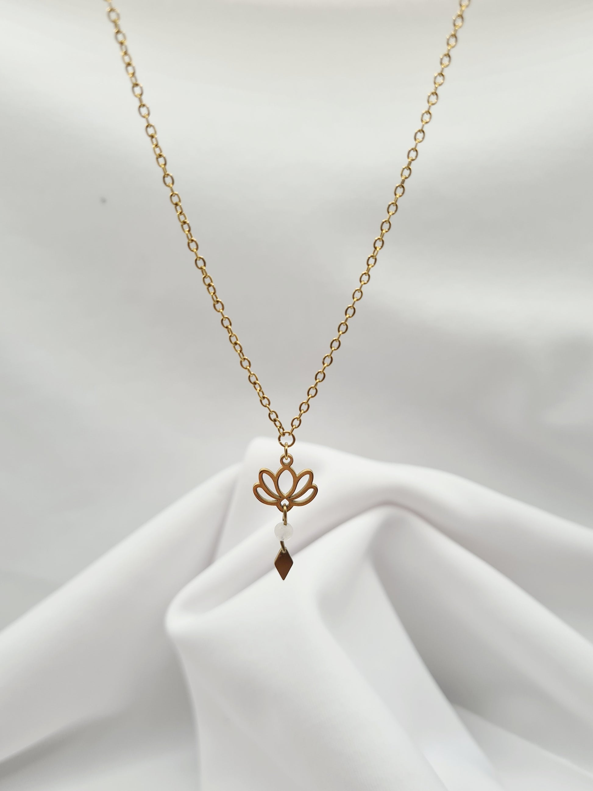 Fleur sacrée est un collier en acier inoxydable avec des pierres naturelles. Tu peux choisir un autre pierre en accord avec toi ;)