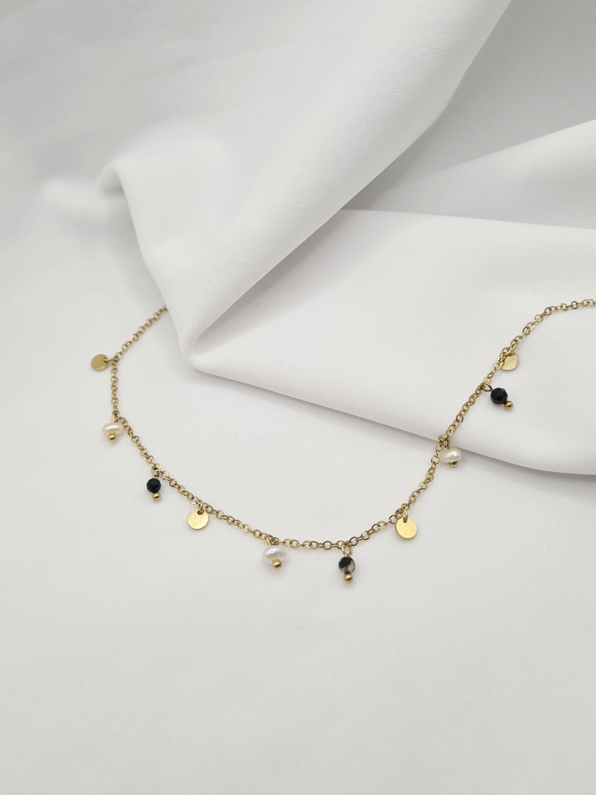 Malou est un collier ras le cou en acier inoxydable avec de véritables perles d’eau douce et de pierre naturelles.