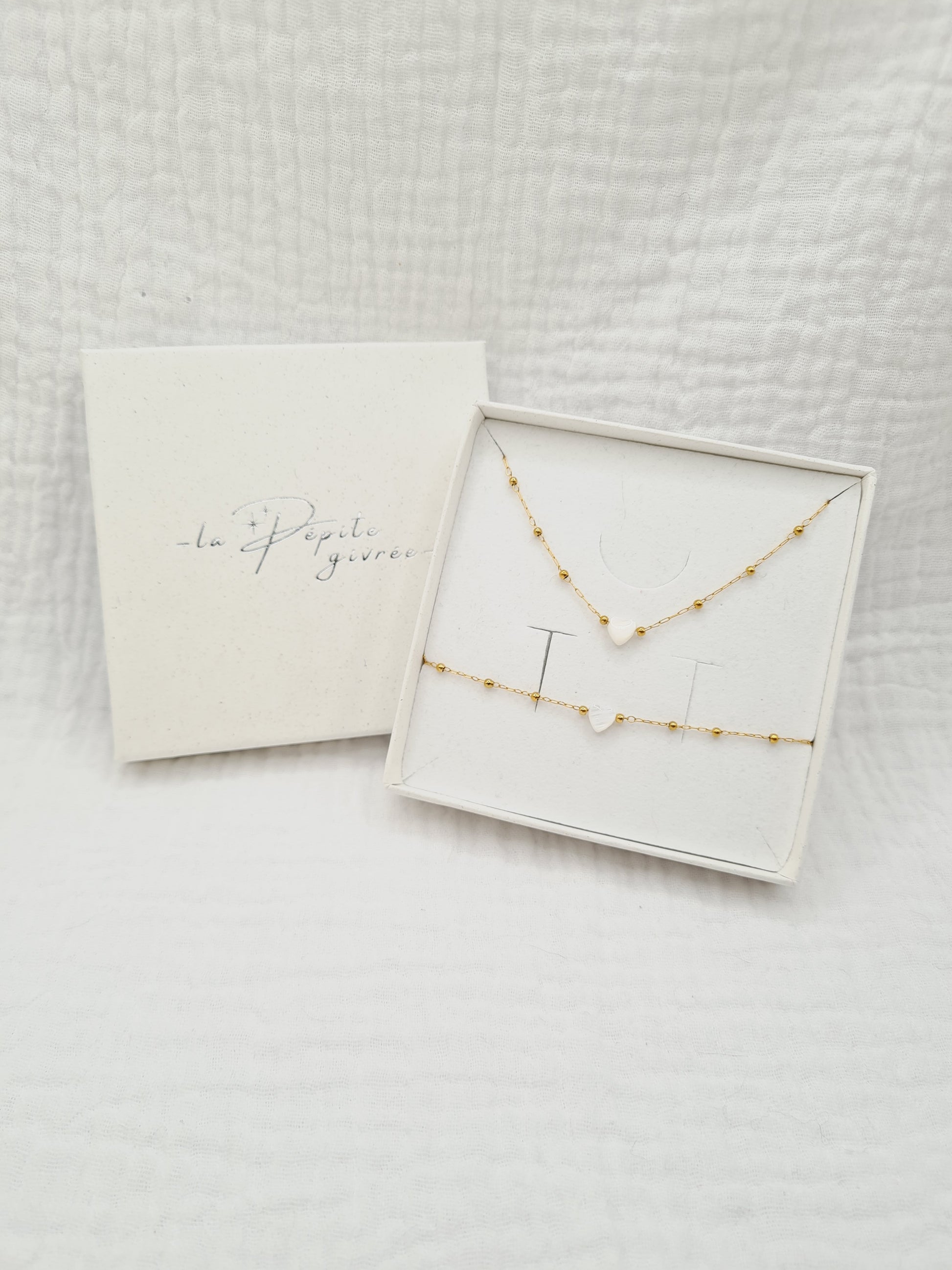 Manon est une parure en acier inoxydable orné d'une pierre naturelle coquillière en forme de coeur.